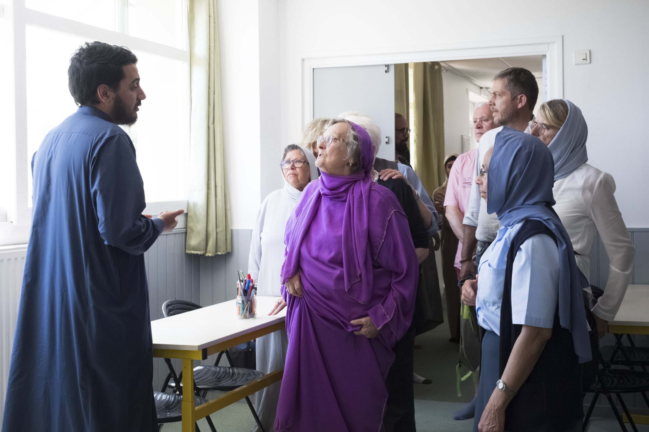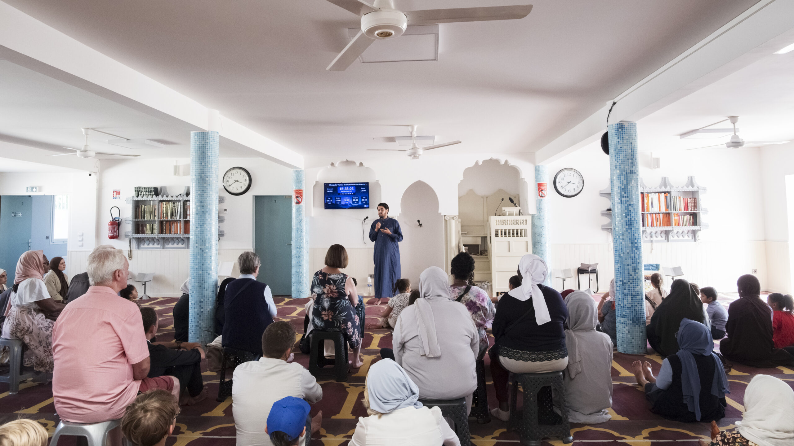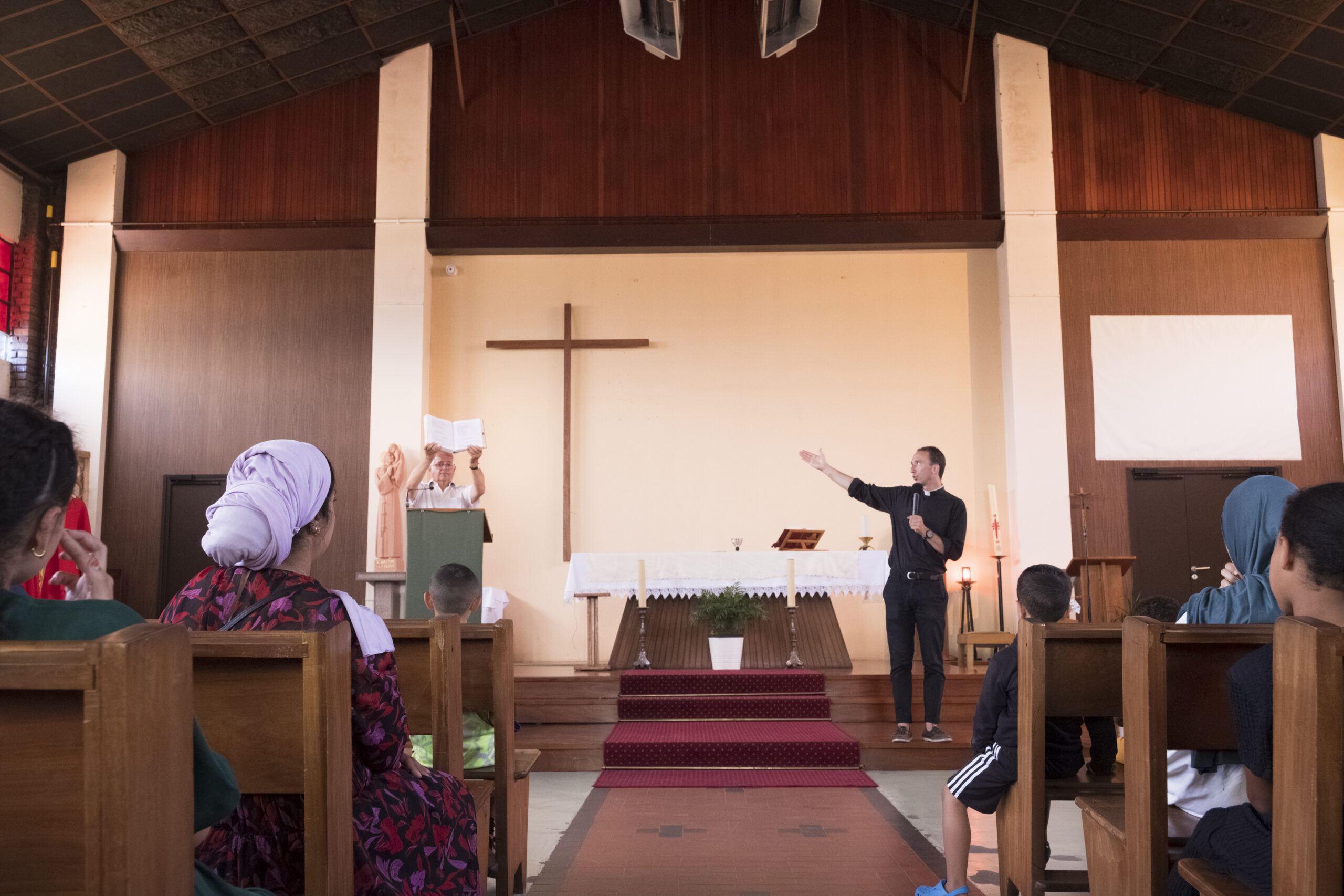 « Il y a deux types de prières, collective et personnelle. Comme chez vous j’imagine… », explique le vicaire avant de détailler, puis d’exaucer les nombreuses mains qui se lèvent. « Vous ne vous purifiez pas avant de prier ? » ; « Vous ne pouvez pas vous marier ? » ; « Y a-t-il un appel à la prière ? » ; « Priez-vous dans une direction particulière ? » Après une grosse demi-heure d’échanges, une jeune fille aimerait enfin qu’on lui explique la trinité : « Ah oui. Ça, on ne le comprendra jamais assez… Il s’agit du père, du fils et du Saint-Esprit. Notre Dieu est trois personnes. Elles sont unies dans un lien d’amour et tout ça forme un seul Dieu, en trois personnes. » Des rires résonnent sur les bancs. « J’ai bien conscience que pour vous ça paraît dingue mais c’est notre foi. Il y a un soleil, des rayons et la chaleur. Trois manières de voir le soleil mais un seul astre, ça vous laisse peut-être avec plus de questions qu’en entrant ! »