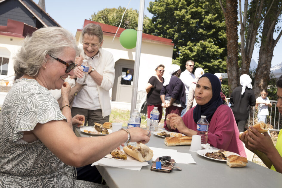 «Il y a presque plus de monde qu’à la messe ! », plaisante le père Jacques Simon au micro de l’église Sainte-Thérèse. Sur les bancs face à lui, une centaine de personnes. Il y a des membres de la paroisse stéphanaise, bien sûr, mais aussi des femmes voilées et des hommes en djellaba. Ce sont les fidèles de la mosquée voisine. En cette chaude journée du 9 juillet, les deux communautés inaugurent « fraternité en fête » : un premier après-midi de rencontres avec barbecue, jeux en plein air, puis visites de l’église et de la mosquée.