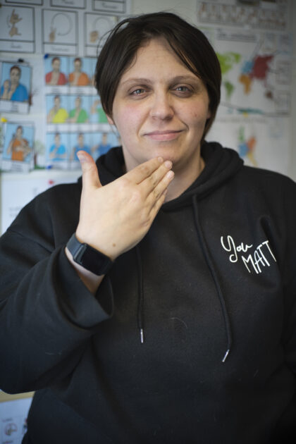 En Langue des Signes Française (LSF), le nom de Gwendoline Bérenger se fait avec le majeur pointé sur le cœur. Un signe choisi par la communauté sourde pour symboliser sa générosité. « J’ai toujours eu envie de construire des ponts, de donner à chacun une place dans l’échange », explique-t-elle avec dynamisme. Bavarde et pétillante, Gwendoline adore échanger et transmettre. Son très bon relationnel avec les enfants fait d’elle une figure appréciée dans les ateliers Oasis, où elle ne manque jamais d’idées pour rendre l’apprentissage ludique. « Je suis toujours en train d’imaginer de nouvelles activités pour rendre la LSF vivante et amusante », confie-t-elle.