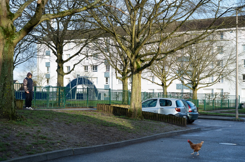 “L’actu est souvent là où on ne l’attend pas, et une nouvelle photo vient parfois s’ajouter à la moisson. Venu ce lundi matin dans le quartier du centre Brassens pour un sujet d’actualité, je tombe — bonheur de photographe — sur cette scène réjouissante d’un riverain en train de promener sa poule! On bavarde. Oui, ce Stéphanais sort bien tous les matins pour faire une petite balade avec ses deux poules, dans la rue et sur la pelouse voisine. Ses deux poules? Mais je n’en vois qu’une! Oui, mais quand il est sorti aujourd’hui, la deuxième était en train de pondre son œuf…