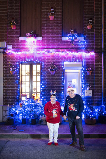 La grosse contrainte des portraits de Stéphanais devant leur maison illuminée était la plage horaire assez courte, de la tombée de la nuit, à la nuit noire, soit une heure 30 environ. Le temps d’un à deux portraits. Celui ci est mon préféré, mais il n’a pas trouvé sa place dans le Stéphanais car je l’ai réalisé moins de 36 heures avant l’envoi à l’imprimeur, la page avait déjà été maquettée, et le format vertical de cette photo aurait obligé à tout recommencer. Cette photo ne vivra que sur les réseaux sociaux.