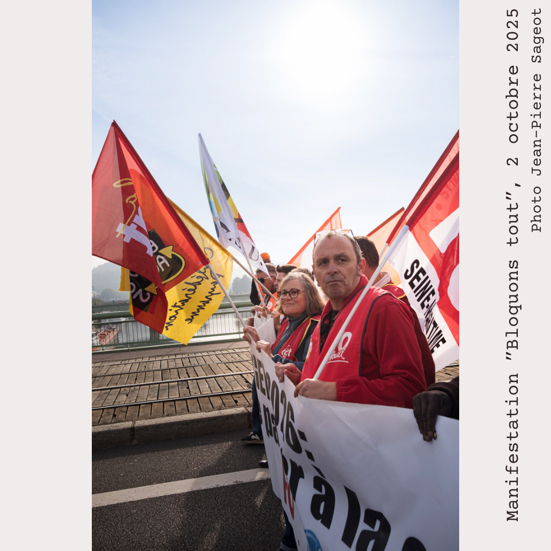 « J’ai aussi été missionné pour suivre la manif du 2 octobre avec une demande supplémentaire pour trouver la photo de Une du Stéphanais d’octobre. Travailler sur une Une est rarement facile, il faut laisser des espaces graphiquement faibles (ou vides) en haut et en bas pour laisser la place à la titraille, avec une photo accrocheuse synthétisant le thème du dossier. En faisant cette photo, très parlante avec ces 2 regards aux sens très différents, je savais que je tenais une photo qui marchait pour raconter la situation du mouvement, mais peut être pas assez claquante/simple/accessible pour une Une. »