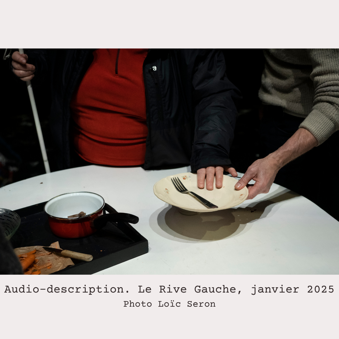 « Reportage sur l’audio-description d’un spectacle du Rive Gauche, en janvier dernier. Les spectateurs malvoyants arrivent avant tout le monde et sont accueillis sur la scène par les comédiens de la pièce qui va être jouée. En tant que photographe devant rendre compte de cette rencontre étonnante, je dois évoluer parmi voyants et non-voyants. Et l’idée me frappe que, tandis que les personnes non-voyantes doivent être prévenus de ma présence (nous les avons avisés à leur arrivée), je dois me faire oublier des autres, comme s’ils ne me voyaient pas, car c’est seulement dans ces conditions que le photographe réussit à capter les scènes les plus authentiques.»