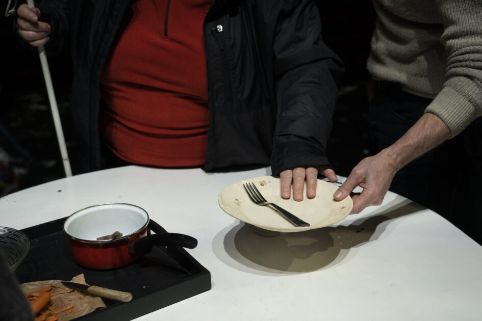 « Reportage sur l’audio-description d’un spectacle du Rive Gauche, en janvier dernier. Les spectateurs malvoyants arrivent avant tout le monde et sont accueillis sur la scène par les comédiens de la pièce qui va être jouée. En tant que photographe devant rendre compte de cette rencontre étonnante, je dois évoluer parmi voyants et non-voyants. Et l’idée me frappe que, tandis que les personnes non-voyantes doivent être prévenus de ma présence (nous les avons avisés à leur arrivée), je dois me faire oublier des autres, comme s’ils ne me voyaient pas, car c’est seulement dans ces conditions que le photographe réussit à capter les scènes les plus authentiques.»