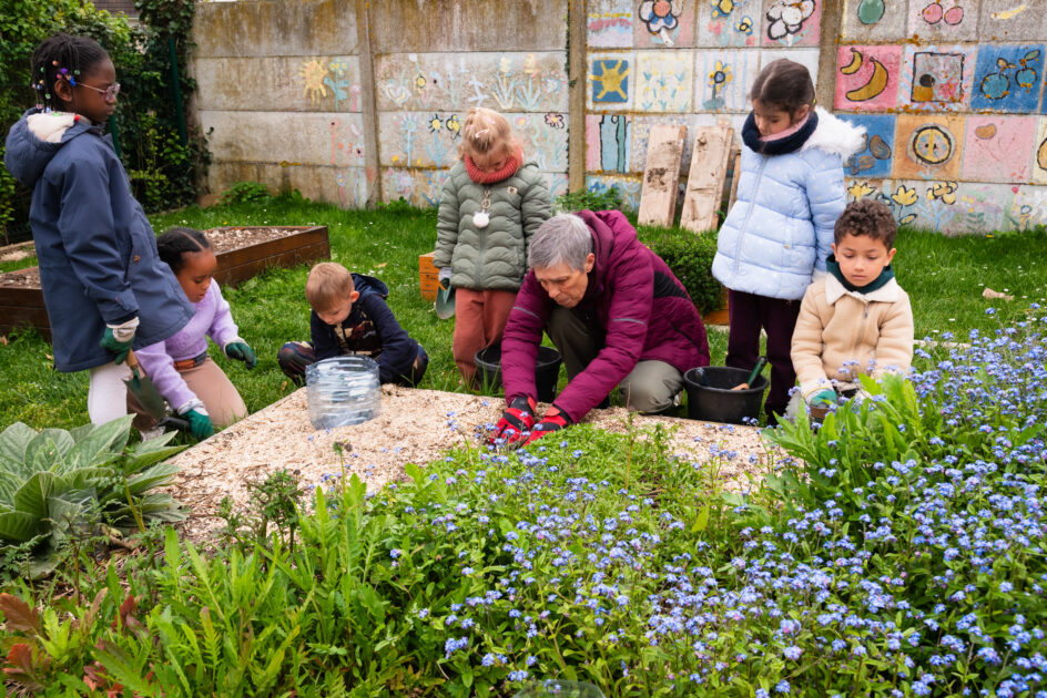 Ce midi-là, Anne est avec un groupe de six petits pour planter des patates. Autour d’un bac, tous les enfants mettent la main à la pelle, s’émerveillent d’un bébé ver de terre et écoutent les explications d’Anne. Les abeilles et les bourdons butinent déjà au cœur des myosotis. Dans les semaines et les mois qui viennent, vont pousser des radis, des carottes, des patates, des haricots, des petits pois, des citrouilles, des tomates, des fraises, des framboises et aussi de l’aneth, de la menthe, du basilic, de la ciboulette et plein de fleurs de toutes les couleurs… Anne a aussi fait pousser du blé ancien, pour montrer aux enfants avec quoi on fait les pâtes et le pain.