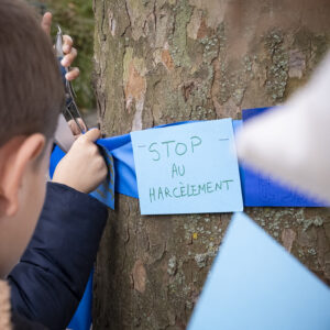 Pas plus qu’ailleurs, mais toujours trop : le harcèlement existe dans les établissements scolaires stéphanais (écoles et collèges) et le prévenir (et le combattre) est une priorité. Le 6 novembre, journée nationale de la lutte contre le harcèlement scolaire, l’école Paul-Langevin en lien avec le collège Paul-Éluard l’ont prouvé. Des élèves sensibilisés à la cause ont accroché près de 500 messages sur papier bleu (la couleur de la lutte contre le harcèlement), rédigés par des élèves, sur la trentaine d’arbres qui longent la rue des Coquelicots et séparent les deux établissements. Une action collective symbolique, mais importante, pour parler du harcèlement, sa prévention et son traitement.